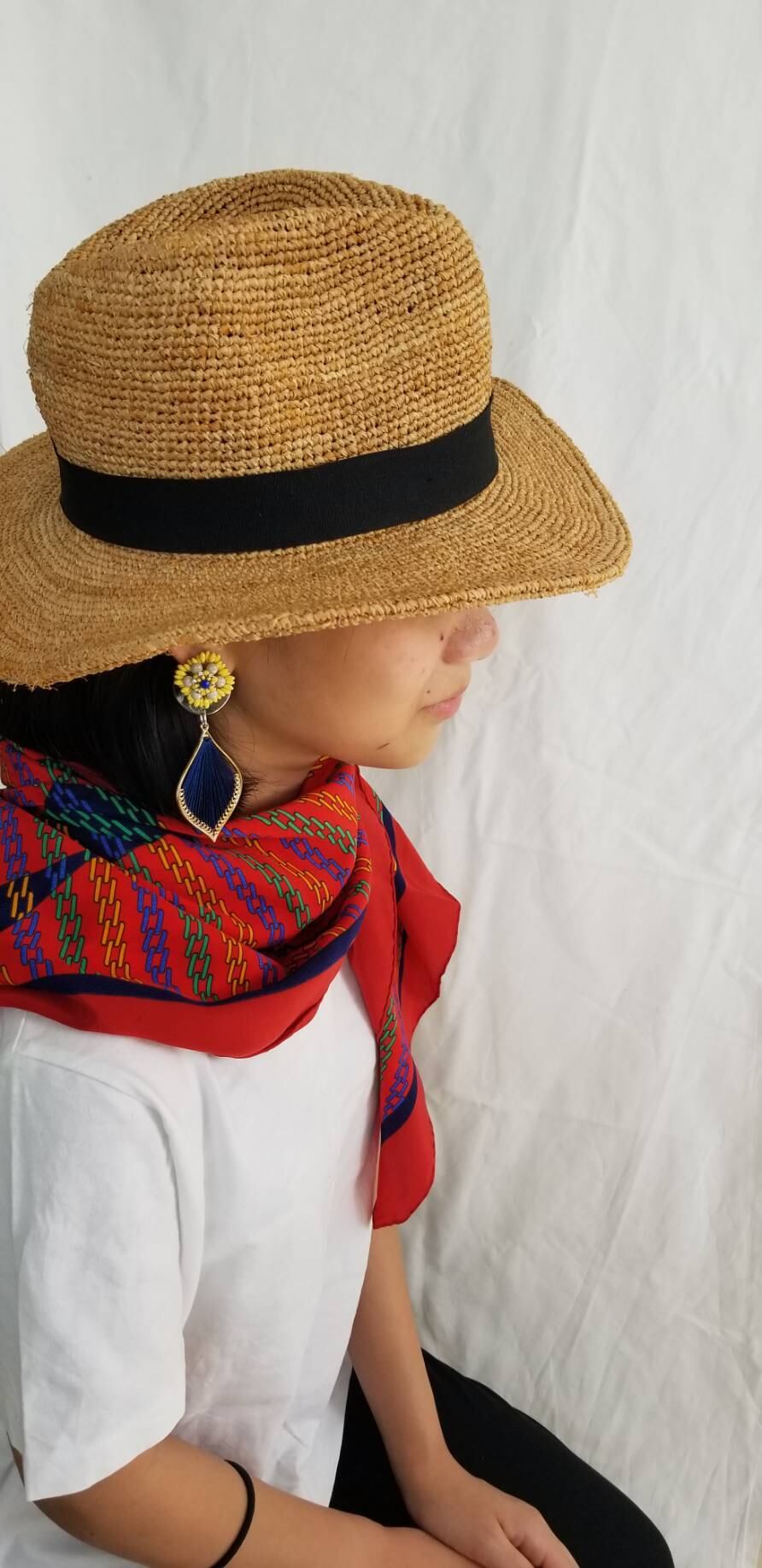 カラフルでインパクトのあるコントラストがお顔周りを華やかな印象を与えるデザインです。